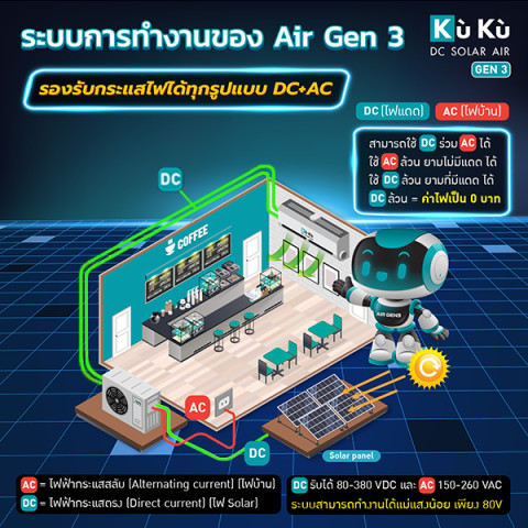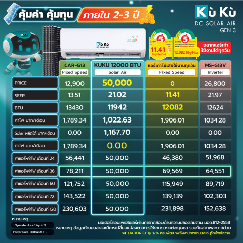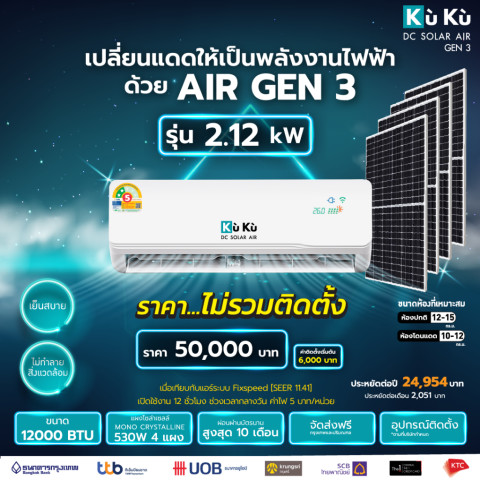 เครื่องปรับอากาศ KUKUairgen3 โซล่าแอร์ GEN3 ขนาด 12,000 BTU คือคำตอบสำหรับคนยุคใหม่ที่ต้องการ “ความเย็นเต็มประสิทธิภาพ” ควบคู่กับ “การประหยัดพลังงานและเงินในกระเป๋า” ในแบบยั่งยืน ใช้พลังงานสะอาด เป็นมิตรต่อสิ่งแวดล้อม และคุ้มค่าในระยะยาวอย่างแท้จริง