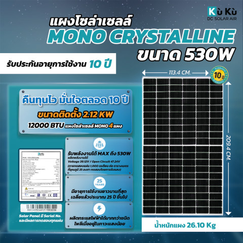 แผงโซล่าเซลล์ Mono 530W จำนวน 4 แผง รวม 2.12 KW