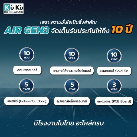 พร้อมบริการหลังการขายโดยบริษัท คูล คูล จำกัด (KUKU DC SOLAR AIR) มีบัตรรับประกันภายในเครื่อง หรือสามารถลงทะเบียนผ่านเว็บไซต์ KUKU ได้โดยตรง
