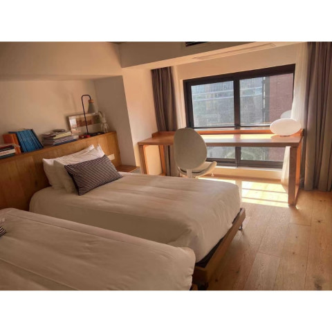 โต๊ะหน้าไม้กว้าง วางหนังสือ แล็ปท็อป โคมไฟ และอุปกรณ์สำนักงานได้อย่างไม่อึดอัด