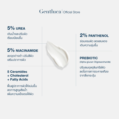 เติมความชุ่มชื้นเข้มข้น 5% Urea ช่วยเพิ่มระดับความชุ่มชื้นให้ผิวกาย พร้อมดูแลผิวแห้ง หยาบกร้าน หรือเป็นขุย ให้นุ่มลื่นขึ้น โดยไม่ระคายเคือง