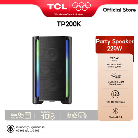 TCL Party Box รุ่น TP200K ลำโพงบลูทูธพลังเสียง 220W ที่สร้างมาเพื่อทุกปาร์ตี้โดยเฉพาะ ผสานพลังเสียงกระหึ่ม เบสลึกหนักแน่น เอฟเฟกต์ไฟสุดมันส์ และแบตเตอรี่ที่ใช้งานได้ยาวนานถึง 12 ชั่วโมง เหมาะสำหรับงานสังสรรค์ทั้งในบ้าน ริมสระน้ำ หรือปาร์ตี้กลางแจ้งในทุกโอกาส