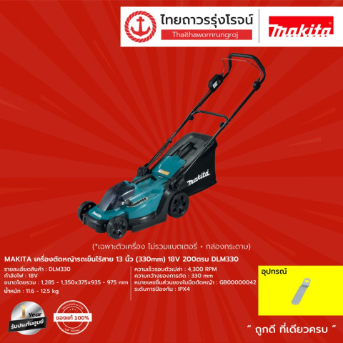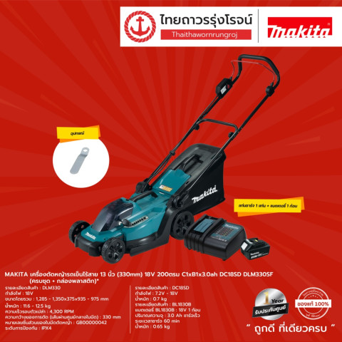 ยกระดับการดูแลสนามหญ้าให้สวยเรียบเนียนได้ง่ายขึ้นด้วย MAKITA DLM330Z / DLM330SF เครื่องตัดหญ้ารถเข็นไร้สาย ขนาดใบมีด 13 นิ้ว (330 มม.) ระบบแบตเตอรี่ 18V จาก Makita แบรนด์เครื่องมือช่างระดับมืออาชีพ ให้คุณตัดหญ้าได้คล่องตัวไร้สายไฟเกะกะ เหมาะสำหรับสวนบ้าน พื้นที่สนามหญ้าประมาณ 200 ตร.ม. ใช้งานง่าย ปลอดภัย และให้พลังตัดต่อเนื่อง