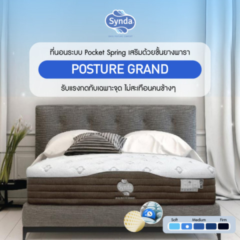 สัมผัสประสบการณ์การนอนระดับพรีเมียมไปกับ Synda ที่นอนระบบพ็อกเกตสปริงเสริมยางพารา รุ่น Posture Grand ความสูง 13 นิ้ว ที่ออกแบบมาเพื่อรองรับสรีระอย่างถูกต้อง ลดแรงกดทับ และช่วยให้คุณหลับสนิทตลอดทั้งคืน เหมาะสำหรับคนที่ต้องการที่นอนนุ่มสบายแต่ยังคงความกระชับและรองรับน้ำหนักได้ดี