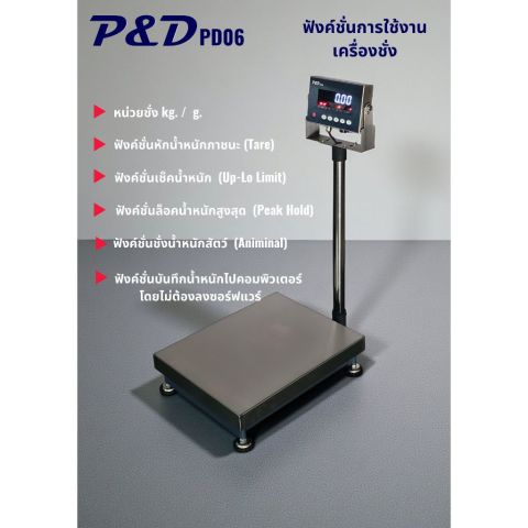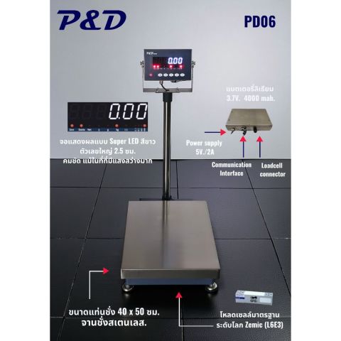 เครื่องชั่งดิจิตอล P&D รุ่น PD06 แท่นชั่งขนาด 40 x 50 ซม. ออกแบบมาเพื่อการชั่งน้ำหนักในงานซื้อขายเชิงพาณิชย์ โรงงานผลิต ร้านค้าปลีก-ส่ง และคลังสินค้า โดยผ่านการตรวจรับรองจากสำนักงานกลางชั่งตวงวัด จึงสามารถใช้ชั่งซื้อขายได้ถูกต้องตามกฎหมาย มั่นใจได้ทั้งด้านความแม่นยำและความน่าเชื่อถือในระยะยาว