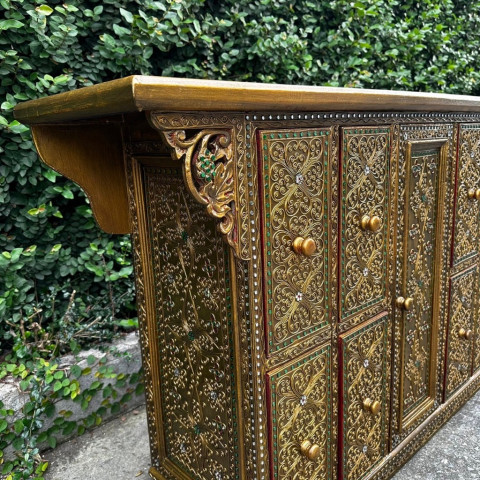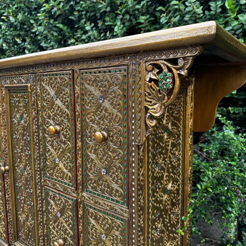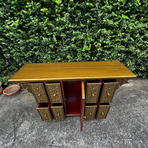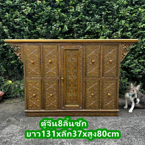 ตู้ไม้แกะสลักสไตล์จีน (ไซซ์ M) 8 ลิ้นชัก เฟอร์นิเจอร์งานฝีมือที่ช่วยยกระดับบรรยากาศบ้านให้ดูหรูคลาสสิกด้วยการเดินเส้นทำเก่าโทน ทองโบราณ และ ประดับกระจกหลากสี เพิ่มมิติความโดดเด่นทุกมุมมอง เหมาะทั้งใช้เป็น โต๊ะคอนโซล, ตู้วางทีวี, ตู้วางพระ หรือ ตู้โชว์/ตู้เก็บของอเนกประสงค์ ได้อย่างลงตัว