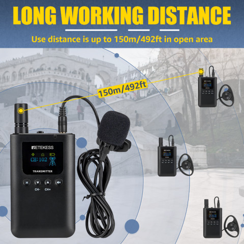 ระยะทำงานสูงสุด 150 ม. / 492 ฟุต ทำให้ผู้ร่วมทัวร์/ผู้ฟังสามารถเดินตามระยะห่างได้อย่างสบาย ยังได้ยินข้อมูลชัดเจนไมโครโฟนในตัว + รองรับไมค์หนีบปก