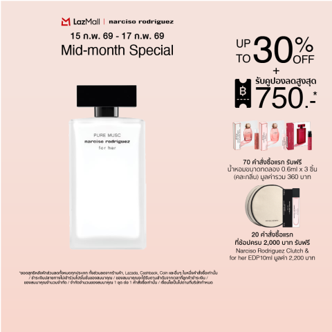Narciso Rodriguez for her Pure Musc EDP น้ำหอมสำหรับผู้หญิงที่ให้ความรู้สึก อ่อนโยน สะอาด แต่ยังคงความ โดดเด่นน่าค้นหา ในแบบมินิมอลหรูหรา กลิ่นมัสก์อันเป็นเอกลักษณ์ของแบรนด์ถ่ายทอดเสน่ห์ที่ใกล้ชิดผิว ราวกับ “กลิ่นกายที่สวยที่สุด” เหมาะสำหรับวันที่อยากดูแพงแบบไม่ต้องพยายาม