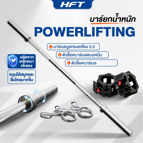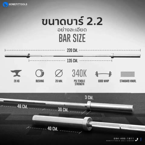 คานบาร์เบลโอลิมปิคยาว 2.2 เมตร น้ำหนักคาน 20 กก. รองรับน้ำหนักสูงสุดได้ถึง 340 กก.