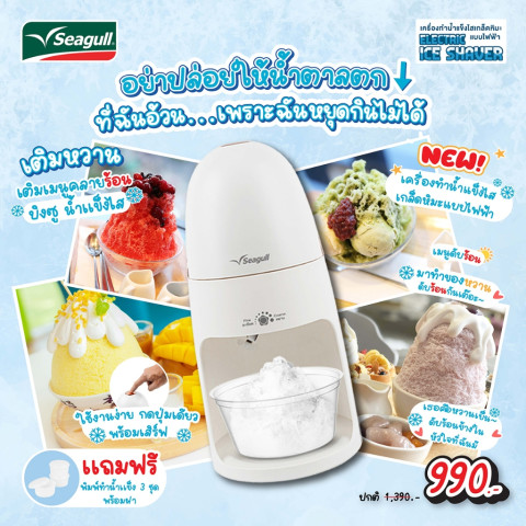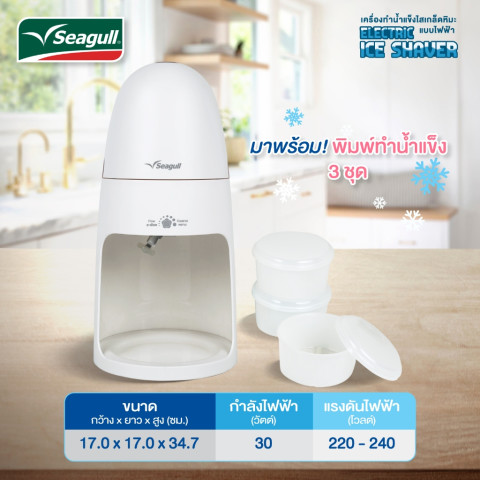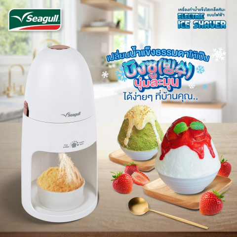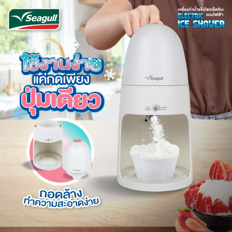 Seagull เครื่องทำน้ำแข็งไสเกล็ดหิมะ แบบไฟฟ้า (Electric Ice Shaver) ช่วยเปลี่ยนน้ำแข็งก้อนธรรมดาให้กลายเป็นเกล็ดหิมะเนียนละเอียดสไตล์บิงซูได้ง่ายๆ แค่กดปุ่มเดียว ไม่ว่าจะทำบิงซู น้ำแข็งไส หรือหวานเย็น ก็พร้อมเสิร์ฟความสดชื่นได้ทุกวัน เหมาะทั้งใช้ในบ้านและทำขายแบบโฮมเมด