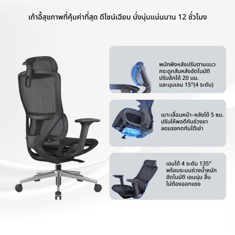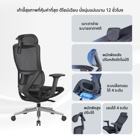 ระบบรองรับเอวอัตโนมัติที่ขยับตามแนวกระดูกสันหลังแบบ Real-Timeพนักพิงปรับตามสรีระอัตโนมัติทุกครั้งที่คุณเปลี่ยนท่า