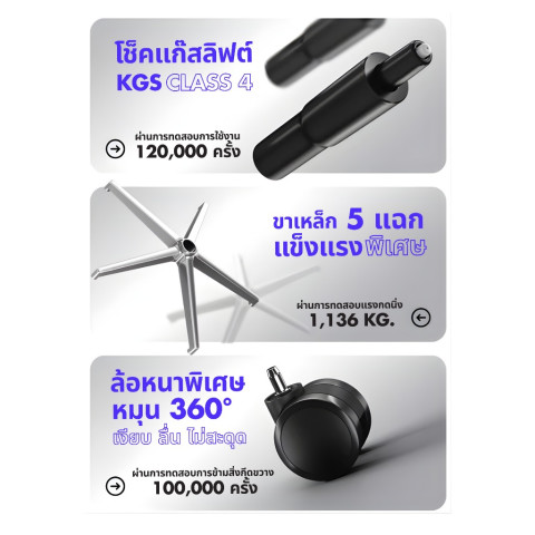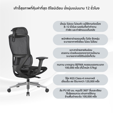 ออกแบบตามหลัก Ergonomic เพื่อให้หลัง เอว คอ ไหล่ และสะโพกอยู่ในท่าที่สมดุล ลดความล้าเวลาทำงานยาว ๆ พร้อมวัสดุและมาตรฐานความทนทานระดับสากล ใช้ได้มั่นใจทุกวัน