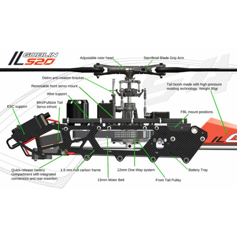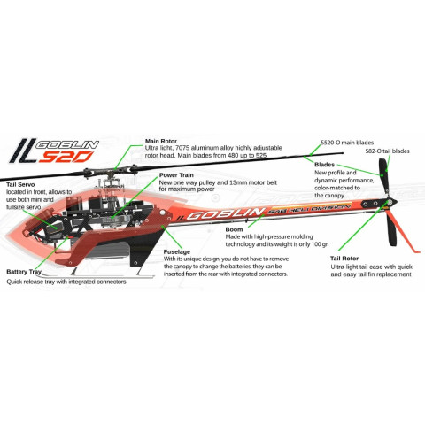 KIT ILGoblin PRO 520 Orange SG525 เฮลิคอปเตอร์ 3D ระดับโปร อัปเกรดจากแนวคิด Goblin Raw500 ด้วยชิ้นส่วนอะไหล่ร่วมกันหลายรายการ ช่วยให้ดูแลง่าย หาอะไหล่สะดวก พร้อมการปรับปรุงสำคัญเพื่อการบินที่นิ่ง คม และตอบสนองไวกว่าเดิม โดยชุดนี้ รวมใบพัดหลัก 520 mm รุ่นใหม่ และ ใบพัดหาง 82 mm ในกล่อง ให้พร้อมเริ่มประกอบได้ทันที