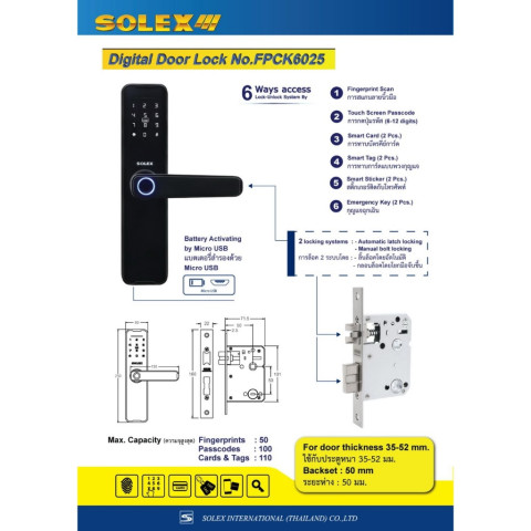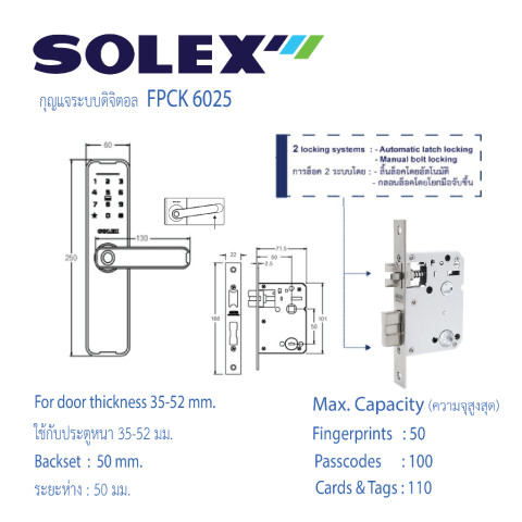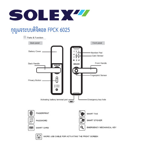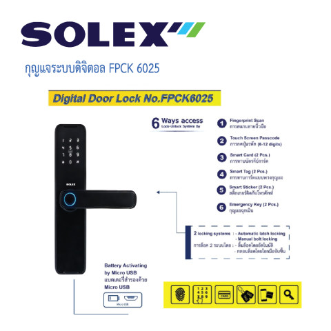 SOLEX กุญแจระบบดิจิตอล No.FPCK 6025 (Digital Door Lock) ราคา 5,800.00 บาท ยกระดับความปลอดภัยและความสะดวกสบายให้บ้าน/คอนโด/ออฟฟิศ ด้วยระบบล็อกอัจฉริยะที่รองรับการเข้า-ออกได้หลายรูปแบบ ใช้งานง่ายผ่าน Bluetooth รองรับทั้ง Android & iOS ดีไซน์สวย แข็งแรงทนทานตามมาตรฐานคุณภาพ ISO 9001:2008