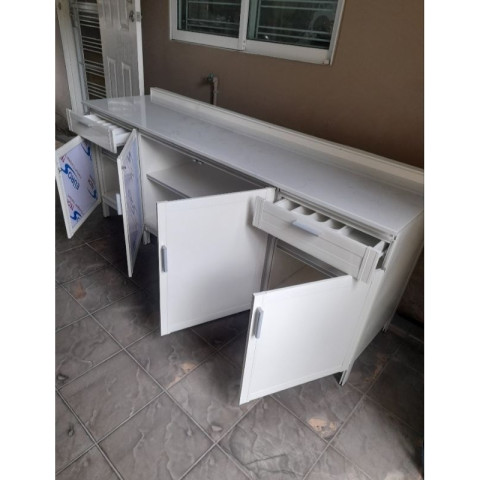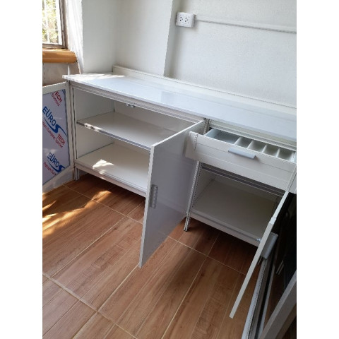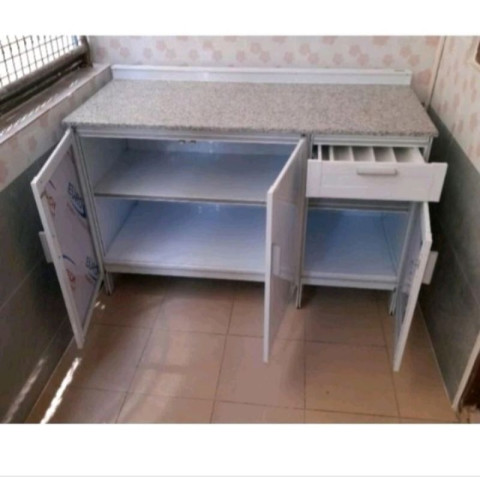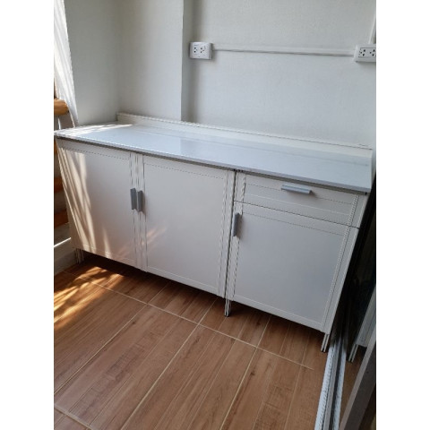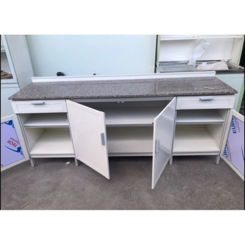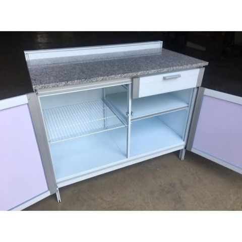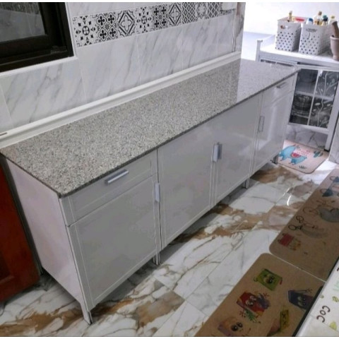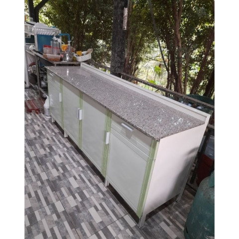 ตู้ครัวอลูมิเนียมแท้ 100% ทรงเตี้ย พร้อม TOP หินแกรนิตแท้ ดีไซน์หน้าบานเรียบ งานประกอบปราณีต สวยงาม ทนทาน เหมาะทั้งครัวบ้านและพื้นที่ชื้น เปียก ใช้งานหนักได้ยาวนาน