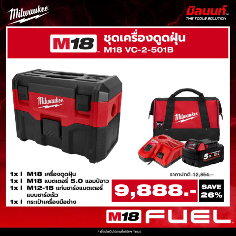 Milwaukee - ชุดเครื่องดูดฝุ่นไร้สาย รุ่น M18VC-2 พร้อมแบตเตอรี่และแท่นชาร์จ QT 2 ในราคา 9,917.52 บาท ชุดสุดคุ้มสำหรับงานช่างและงานทำความสะอาดหน้างานที่ต้องการความคล่องตัวสูง ใช้งานได้ทั้งดูดฝุ่นแห้งและเศษผงจากการทำงาน ไม่ต้องพึ่งปลั๊กไฟ เคลื่อนย้ายง่าย เหมาะสำหรับไซต์งาน โรงรถ งานติดตั้ง และการดูแลพื้นที่ทำงานให้สะอาดพร้อมใช้งานเสมอ