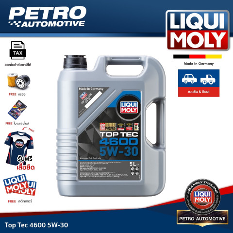 Liqui Moly Top Tec 4600 5W-30 ขนาด 5 ลิตร น้ำมันเครื่องสังเคราะห์แท้จากเยอรมนี 🇩🇪 สำหรับเครื่องยนต์เบนซิน/ดีเซล รองรับระบบ DPF ช่วยให้เครื่องเดินเรียบ เงียบ ลื่น ลดการสึกหรอ และช่วยประหยัดเชื้อเพลิง เหมาะทั้งใช้งานทั่วไปและการขับขี่หนัก โดยเฉพาะรถที่ต้องการปริมาณน้ำมันมาก เช่น SUV/กระบะ/MPV