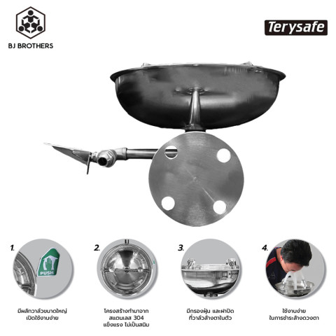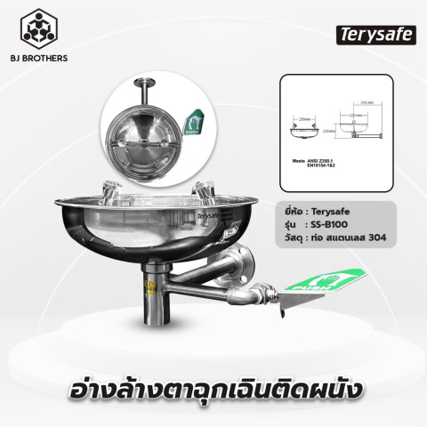 อ่างล้างตาฉุกเฉินติดผนัง สแตนเลส SS-B100 (Terysafe) ราคา 6,955.00 บาท — อุปกรณ์ความปลอดภัยสำคัญสำหรับพื้นที่เสี่ยงสารเคมีและฝุ่นละออง ติดตั้งแบบติดผนัง ประหยัดพื้นที่ ใช้งานง่ายเพียงผลักคันโยกวาล์วน้ำ ก็พร้อมล้างตาได้ทันทีในสถานการณ์ฉุกเฉิน