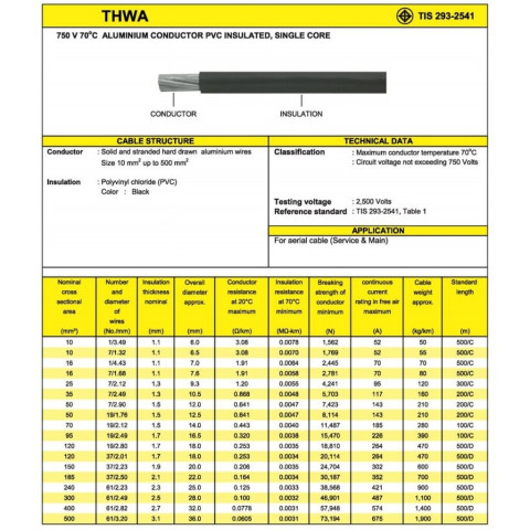 ประเภทสาย: THW-A (สายไฟอลูมิเนียม หุ้มฉนวน PVC)