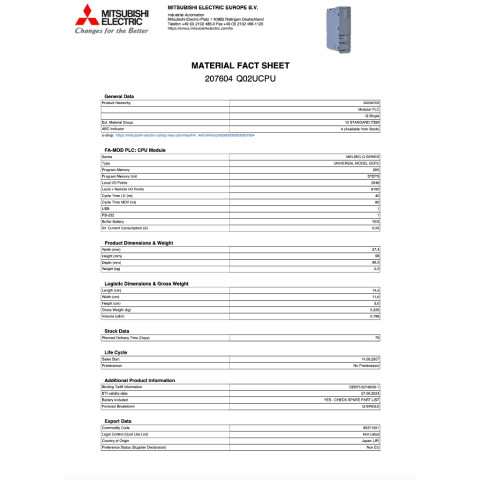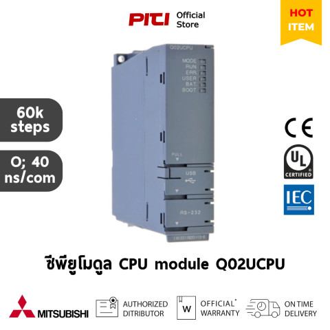Mitsubishi ซีพียูโมดูล Q02UCPU (Q Series iQ CPU Module) คือหัวใจสำคัญของระบบควบคุมอัตโนมัติ (PLC) สำหรับงานอุตสาหกรรมที่ต้องการความเร็วและความเสถียรสูง รองรับการประมวลผลแบบ Real-time ด้วยความเร็ว 40 ns/คำสั่ง พร้อมรองรับ I/O ได้สูงสุด 2048 จุด และความจุโปรแกรม 20k steps เหมาะสำหรับไลน์การผลิต เครื่องจักรอัตโนมัติ และระบบควบคุมที่ต้องทำงานต่อเนื่องตลอดเวลา