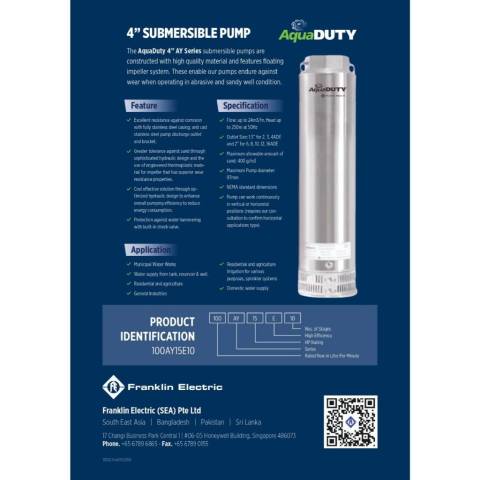FRANKLIN AQUADUTY ปั๊มบาดาล 1HP 220V ปั๊มซัมเมอร์สสำหรับบ่อบาดาล ขนาดบ่อ 4–6 นิ้วขึ้นไป เหมาะสำหรับงานสูบน้ำเพื่อ เกษตร/สวน/ระบบน้ำบ้าน/งานบาดาล ให้แรงดันสม่ำเสมอ ตัวเรือนสแตนเลสทั้งชุด แข็งแรงทนทาน ใช้งานได้มั่นใจ พร้อม รับประกัน 1 ปี (ตามเงื่อนไขบริษัท)