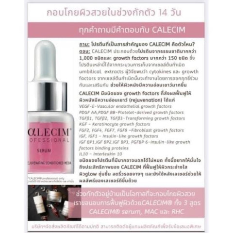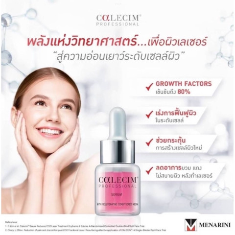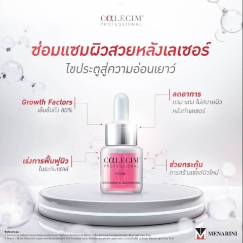 Calecim Growth Factors สารสกัดเซลล์ต้นกำเนิดของสายสะดือกวางแดง 6 ขวด/กล่อง (ราคา 9,900.00 บาท) คือเซรั่มฟื้นฟูผิวระดับโปร ที่ออกแบบมาเพื่อช่วยลด Downtime และเร่งการซ่อมแซมผิวหลังทำหัตถการ โดยใช้สารสกัดจาก เยื่อบุสายสะดือกวางแดง (Red Deer Umbilical Cord Lining) จากเทือกเขาสูงประเทศนิวซีแลนด์ ผลิตและนำเข้าจากประเทศสิงคโปร์ และ ผ่าน อย. ไทย เหมาะทั้งสำหรับการดูแลผิวหลังเลเซอร์และเป็นส่วนหนึ่งของโปรแกรมดูแลผิวเชิงเวชสำอางที่ต้องการผลลัพธ์ชัดเจน