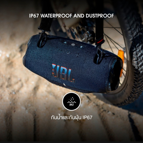 JBL Xtreme 4 ลำโพงบลูทูธแบบพกพาพร้อมสายสะพายและที่เปิดขวดในตัว ออกแบบมาให้พร้อมลุยทุกทริป ให้เสียงดังชัด เติมบรรยากาศได้ทั้งในบ้าน นอกบ้าน หรือปาร์ตี้ริมสระ ด้วยมาตรฐานกันน้ำกันฝุ่น IP67 และแบตเตอรี่ใช้งานได้นานสูงสุด 24 ชั่วโมง ชาร์จเต็มไว ใช้งานต่อเนื่องได้สบายตลอดวัน