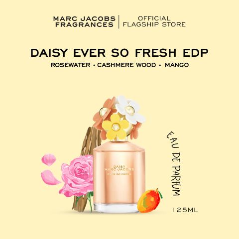 Marc Jacobs Fragrances Daisy Ever So Fresh Eau de Parfum 125ml น้ำหอมกลิ่นสดใสที่ให้ความรู้สึกเหมือนแสงแดดอุ่น ๆ ในวันสบาย ๆ โดดเด่นด้วยความชุ่มฉ่ำของโทนซีตรัส ผสานความหวานละมุนของฟลอรัล ก่อนทิ้งท้ายด้วยความนุ่มลึกอบอุ่นจากแคชเมียร์วู้ด กลิ่นติดทนนาน ใส่ได้ทุกวันตั้งแต่เช้าจรดค่ำ