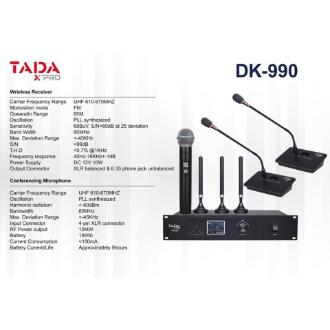 TADA DK-990 ชุดไมค์ประชุมไร้สายระดับมืออาชีพ สำหรับห้องประชุม อบรม สัมมนา และงานอีเวนต์ที่ต้องการเสียงชัดเจน ควบคุมง่าย พร้อมไมค์แบบตั้งโต๊ะก้านยาว 53 ซม. ให้การรับเสียงพูดเป็นธรรมชาติ เพิ่มความมั่นใจทุกการนำเสนอ จุดเด่นคือไมค์แต่ละตัวมี แบตเตอรี่ในตัว (18650) ใช้งานสะดวก ไม่ต้องเดินสายให้ยุ่งยาก รองรับระบบ UHF เสถียร ระยะใช้งานสูงสุด 60 เมตร และสามารถ ขยายจำนวนไมค์ผู้ร่วมประชุมได้สูงสุด 96 ตัว เหมาะกับห้องประชุมขนาดกลางถึงใหญ่