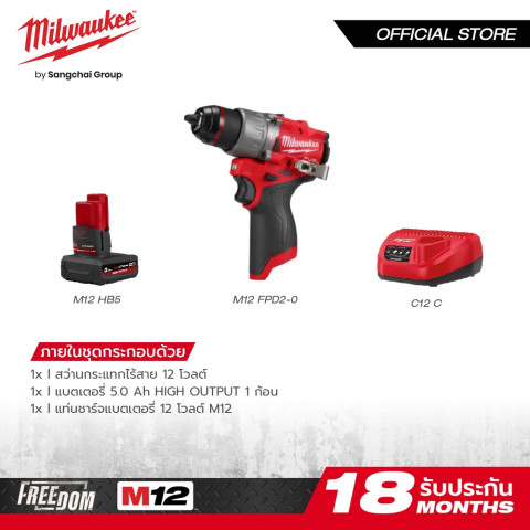 Milwaukee M12 FPD2-0 สว่านกระแทกไร้สาย 12V ชุดคุ้มพร้อมแบตเตอรี่ M12 HB5 5.0Ah HIGH OUTPUT และแท่นชาร์จ C12C ให้พลังจัดเต็มในขนาดกะทัดรัด เหมาะทั้งงานเจาะ งานขันสกรู และงานเจาะกระแทกที่ต้องการความเร็วและความคล่องตัว ใช้งานง่ายในพื้นที่แคบ พร้อมไฟ LED ช่วยส่องสว่างให้ทำงานได้แม่นยำยิ่งขึ้น