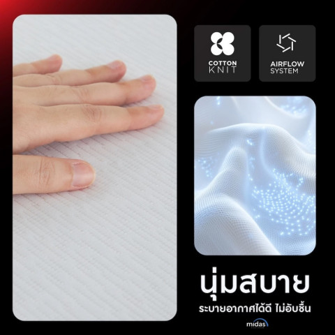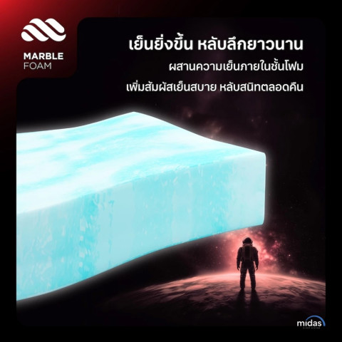 Midas ที่นอน รุ่น LUMA ULTRA (ขนาด 5 ฟุต) ที่นอนในกล่องที่ให้คุณหลับสบายแบบ “เย็นขึ้น นุ่มพอดี รองรับดี” ด้วยชั้น Cooling Foam ช่วยลดความร้อนสะสมบนผิวสัมผัส ลดปัญหาเหงื่อซึมระหว่างคืน ผสาน Charcoal Foam ช่วยลดกลิ่นอับ ระบายความชื้น และเพิ่มความรู้สึกปลอดโปร่งตลอดการพักผ่อน พร้อมฐาน Marble Foam Base ที่ออกแบบให้กระจายน้ำหนักได้อย่างมีประสิทธิภาพ ลดแรงกดทับ และช่วยจัดแนวกระดูกสันหลังให้เหมาะสมในระยะยาว