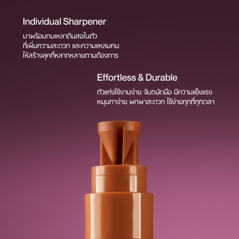 สูตรผสาน สารสกัดน้ำมันมะพร้าว และ วิตามินอี ช่วยบำรุงผิวบริเวณเปลือกตาและช่วยปกป้องผิวจากอนุมูลอิสระ อีกทั้งยังมี กบเหลาในตัว ที่ก้นแท่ง เพิ่มความเป๊ะทุกเส้นทุกมุม ใช้งานสะดวกทั้งที่บ้านและพกพา