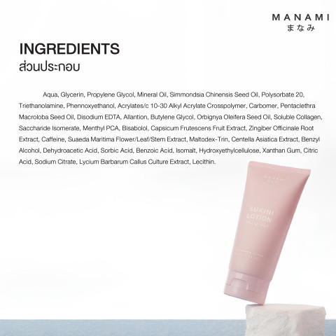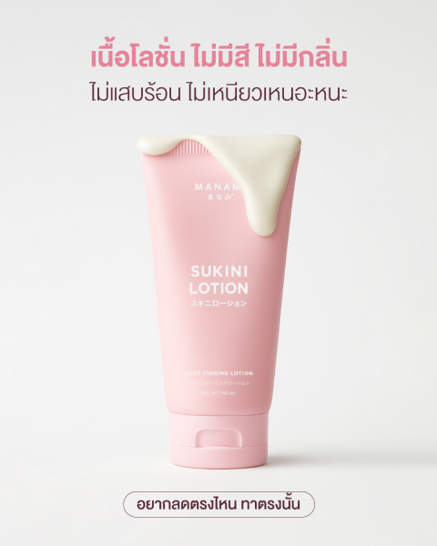 MANAMI SUKINI LOTION 150 ML มานามิ ซูกินี โลชั่น สูตรไม่ร้อน โลชั่นบำรุงผิวเนื้อบางเบา ซึมไว ไม่เหนียวเหนอะหนะ ใช้แทนครีมบำรุงผิวทั่วไปได้ในทุกวัน พร้อมดูแลผิวบริเวณที่ต้องการความกระชับเป็นพิเศษด้วยสูตร “ไม่ร้อน” จึงเหมาะกับผู้ที่ไม่ชอบความรู้สึกอุ่น/แสบร้อนขณะทา ให้ผิวดูเรียบเนียนและนุ่มชุ่มชื้นอย่างเป็นธรรมชาติ