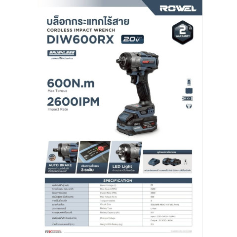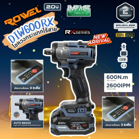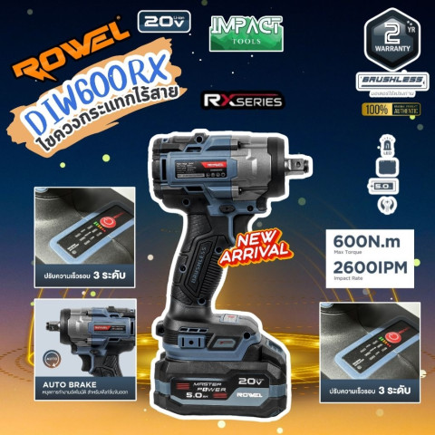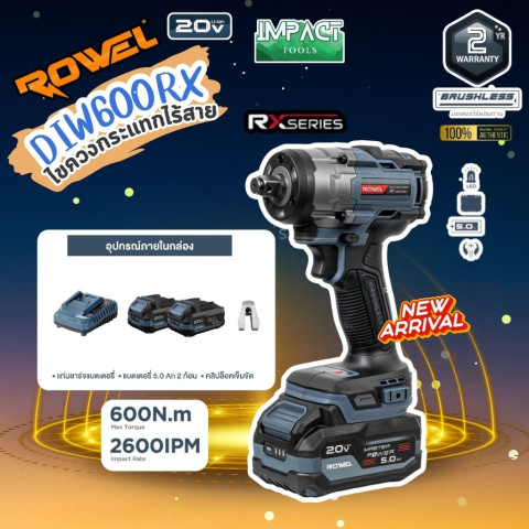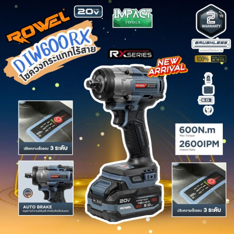 ROWEL บล๊อกกระแทกไร้สาย รุ่น DIW600Rx ขนาดกะทัดรัดแต่ทรงพลัง ตอบโจทย์งานขัน-คลายน็อตหนัก ๆ ได้อย่างมั่นใจด้วยแรงบิดสูงถึง 600Nm พร้อม มอเตอร์ Brushless ที่ให้กำลังสม่ำเสมอ ใช้งานทนทาน และเหมาะทั้งงานช่างมืออาชีพ/งานซ่อมบำรุง/งานยานยนต์