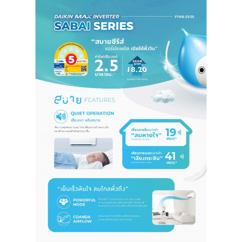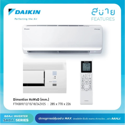 แอร์ไดกิ้น (DAIKIN) รุ่น FTKB-AV2S : SABAI Inverter Series (Japan Quality New 2026!) ขนาด 9,200 BTU ราคาเพียง 12,089 บาท เครื่องปรับอากาศอินเวอร์เตอร์มาตรฐานญี่ปุ่น ที่ออกแบบมาเพื่อความเย็นสบาย ประหยัดไฟ และทนทาน เหมาะสำหรับห้องพักอาศัย คอนโด และโฮมออฟฟิศ ที่ต้องการความคุ้มค่าในระยะยาว
