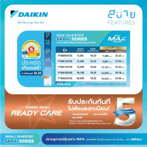 ค่า SEER สูงถึง 18.20 ได้ฉลากประหยัดไฟเบอร์ 5 ช่วยลดค่าไฟฟ้าอย่างเห็นได้ชัด