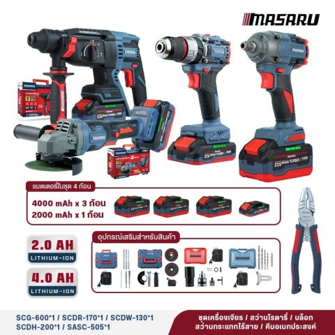 ยกระดับงานช่างและงานซ่อมของคุณให้ครบจบในชุดเดียวด้วย SET 5 ชิ้น เครื่องเจียรไร้สาย บล็อคไร้สาย โรตารี่ สว่านกระแทก คีมอเนกประสงค์ MASARU พร้อมแบตและอุปกรณ์ ชุดเครื่องมือไร้สายระบบ 20V ที่ออกแบบมาเพื่อทั้งช่างมืออาชีพและสายงาน DIY ที่ต้องการความคล่องตัว ทนทาน และพลังแรงอย่างต่อเนื่อง ในราคาสุดคุ้มเพียง ฿6,666.41