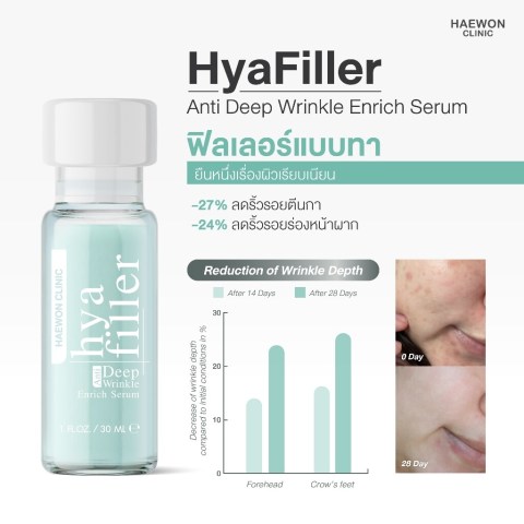 เติมผิวหน้าให้อิ่มฟู ดูเด็กกว่าวัยแบบไม่ต้องฉีด ด้วย Haewon Hya Filler Serum 30 ml ฟิลเลอร์แบบทาตัวดังจากเกาหลีสไตล์ แฮวอน ไฮยา เซรั่ม ไฮยาลูรอน เข้มข้น ช่วยจัดการปัญหาริ้วรอย ร่องลึก และผิวหย่อนคล้อยให้กลับมาดูเต่งตึง ฉ่ำใส สุขภาพดี เหมือนผิวได้ฟิลเลอร์แต่ไม่ต้องเจ็บตัว เหมาะสำหรับคนที่อยากหน้าเด็ก หน้าแน่น ผิวเนียนละเอียด และเพิ่มความชุ่มชื้นให้ผิวได้แบบเต็มแม็กซ์