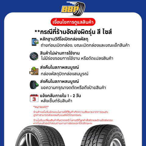 ไม่รับเปลี่ยน/คืนสินค้าในกรณีลูกค้าสั่งขนาดผิด กรุณาตรวจสอบขนาดยางเดิมของรถให้แน่ใจก่อนสั่งซื้อ