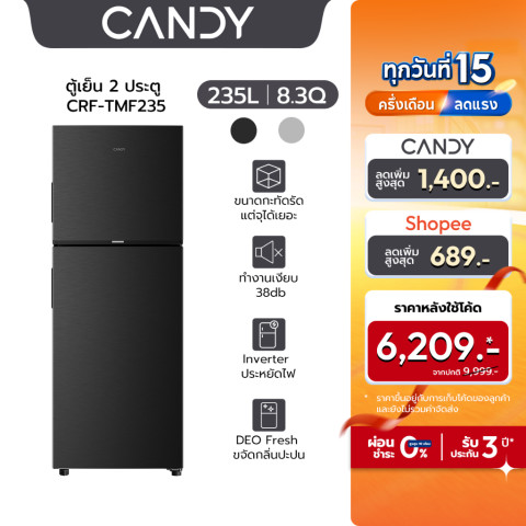 Candy ตู้เย็นสองประตู ขนาด 8.3 คิว ความจุ 235 ลิตร รุ่น CRF-TMF235 Ultraspace Series สีดำ ดีไซน์อิตาเลียนสุดหรู ในขนาดกะทัดรัดที่พร้อมเก็บความสดใหม่ของวัตถุดิบทั้งสัปดาห์ เหมาะสำหรับคอนโด ห้องพัก หรือบ้านที่ต้องการตู้เย็นประหยัดพื้นที่ แต่ยังต้องการความจุจัดเต็ม พร้อมระบบอินเวอร์เตอร์ประหยัดไฟเบอร์ 5 และเทคโนโลยีขจัดกลิ่นล้ำสมัย