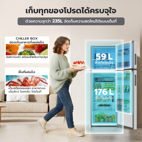 ความจุ 235 ลิตร / 8.3 คิว ไซส์ Mini แต่จุของได้เยอะ จัดเก็บได้ทั้งผัก ผลไม้ เนื้อสัตว์ ของสด และเครื่องดื่มสำหรับทั้งครอบครัว