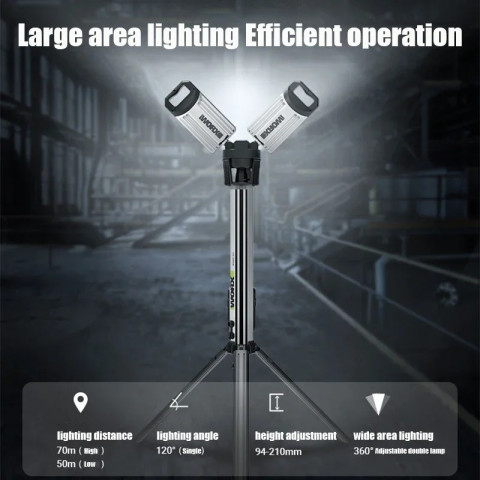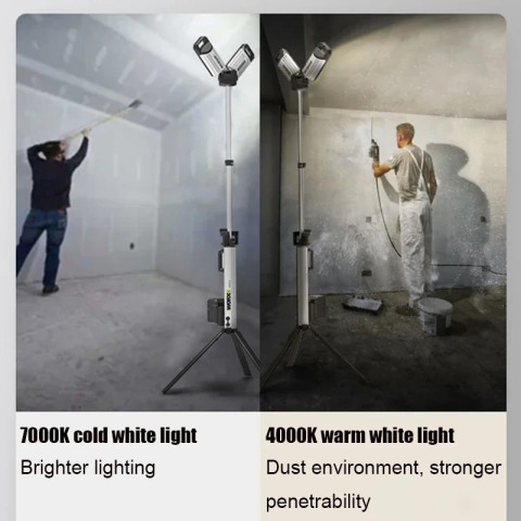 โคมไฟรุ่นนี้เป็นแบบไร้สาย ใช้งานด้วยแบตเตอรี่ 20V ทำให้เคลื่อนย้ายสะดวก ไม่มีสายไฟเกะกะ ใช้งานได้คล่องในพื้นที่แคบหรือจุดอับไฟ ให้ค่าความสว่างสูงถึง 4500 ลูเมน มองเห็นรายละเอียดงานได้ชัดทั้งในที่มืดและพื้นที่สว่างไม่เพียงพอ