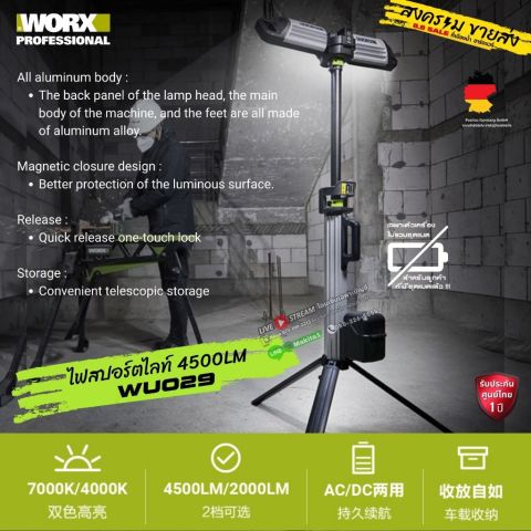 [พร้อมส่งในไทย] WORX รุ่น WU029 โคมไฟสปอร์ตไลท์ไร้สาย 20V 4500 ลูเมน (ตัวเปล่า) ไฟส่องสว่างกำลังสูงสำหรับงานช่างและงานภาคสนาม ให้แสงสว่างชัดเจน ครอบคลุมพื้นที่การทำงานได้อย่างมีประสิทธิภาพ เหมาะสำหรับช่างมืออาชีพ งานซ่อมบำรุง งานไซต์ก่อสร้าง หรือใช้ในโรงงานและโกดังสินค้า มาพร้อมดีไซน์แข็งแรง ทนทาน ใช้งานสะดวก ปรับตำแหน่งได้หลากหลาย รองรับการทำงานทั้งในและนอกสถานที่