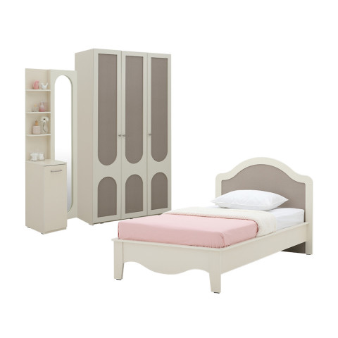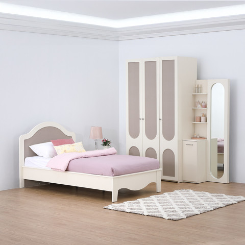 ภายในชุดประกอบด้วย เตียงเดี่ยว 3.5 ฟุต, ตู้เสื้อผ้า 3 บาน และโต๊ะเครื่องแป้งแบบยืน ดีไซน์ในสไตล์เดียวกันทั้งชุด ช่วยให้ห้องนอนดูเป็นธีมเดียวกันอย่างกลมกลืน ให้คุณแต่งห้องครบ จบในเซ็ตเดียว