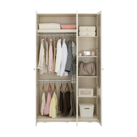 ตู้เสื้อผ้าขนาดกำลังดีสำหรับจัดเก็บเสื้อผ้าและของใช้ได้อย่างเป็นสัดส่วน เหมาะทั้งสำหรับวัยทำงานและเด็กโตผลิตจากไม้พาร์ทิเคิลเกรดสูง (E1) หุ้มฟอยล์สีไอวอรี่และฟอยล์ลายผ้าสีน้ำตาล แมตช์เข้าชุดกับเตียง