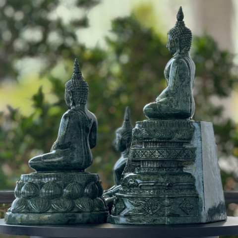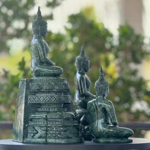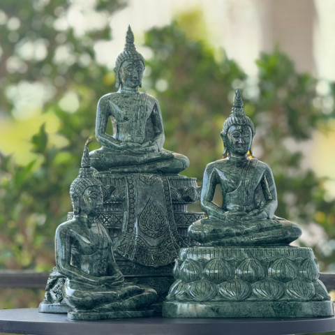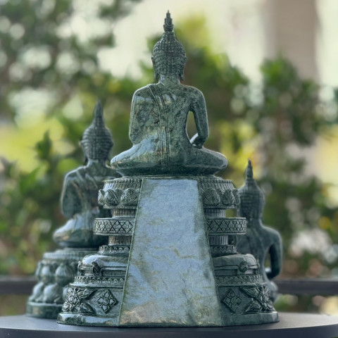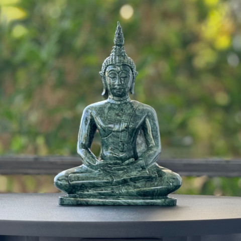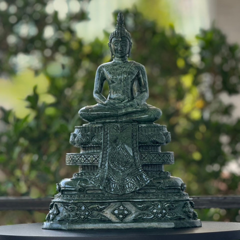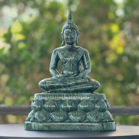 พระพุทธรูปองค์นี้แกะสลักจากหินเขียวอินเดีย (Indian Green Stone) หินธรรมชาติสีเขียวสวยงาม เนื้อละเอียดและทนทาน นิยมใช้ในงานประติมากรรมและตกแต่งภายใน มีความเชื่อว่าเป็นหินที่ช่วยดึงดูดพลังบวก โชคลาภ ความสมดุลทางอารมณ์ และความร่มเย็นให้กับผู้อยู่อาศัย ยิ่งเมื่อนำมารังสรรค์เป็นองค์พระพุทธรูป จึงยิ่งเสริมความเป็นสิริมงคลและคุณค่าทางจิตใจ
