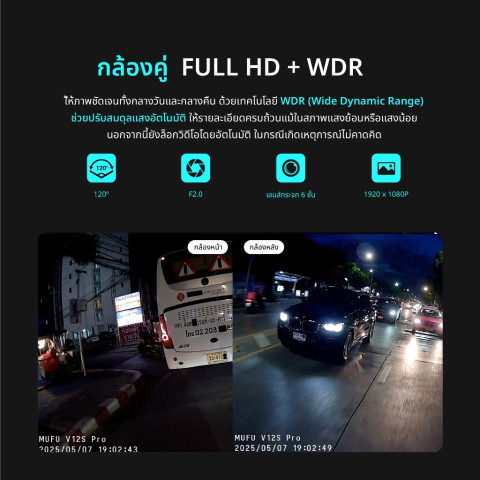บันทึกวิดีโอจาก กล้องหน้าและกล้องหลัง 1920x1080 @30fps ให้รายละเอียดครบ เห็นเหตุการณ์ชัดเจนทั้งสองมุมมองWDR เก็บรายละเอียดแสงได้ดี