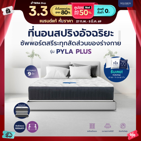 3.3 SOLOMON ที่นอนสปริงอัจฉริยะ รุ่น Pyla Plus (พายล่า พลัส) คือคำตอบของการนอนสบายที่รองรับสรีระได้อย่างมั่นใจ เหมาะสำหรับผู้ที่ต้องการที่นอนสปริงคุณภาพดีในราคาคุ้มค่า เพียง 4,658.00 บาท ให้คุณตื่นมาแบบสดชื่น ลดความเมื่อยล้าจากการนอนบนที่นอนที่รองรับไม่เต็มที่