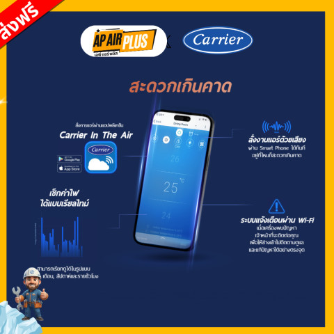 ควบคุมผ่านแอป Carrier In The Air เชื่อมต่อ Wi‑Fi สั่งงานแอร์ผ่านสมาร์ตโฟนได้ทันที ไม่ว่าคุณจะอยู่ที่ไหน เปิด–ปิด ปรับอุณหภูมิ ตั้งเวลา หรือเลือกโหมดการทำงานได้สะดวกในปลายนิ้ว