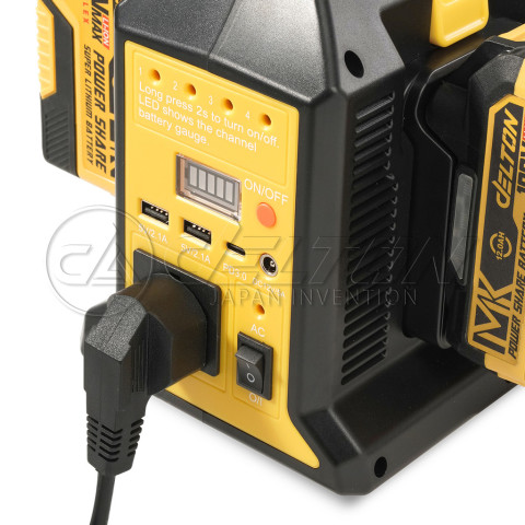 รองรับแรงดันขาเข้า DC 18V–21V จากแบตเตอรี่ พร้อมแปลงเป็นไฟบ้าน AC 220V~ 50Hz ให้ใช้งานเครื่องใช้ไฟฟ้าขนาดเล็กถึงปานกลางได้สบาย กำลังไฟรวมสูงสุด 300W เพียงใส่แบตเตอรี่ก็พร้อมจ่ายไฟได้ทุกที่โดยไม่ต้องง้อปลั๊กผนังPowerShare ใช้แบตร่วมกันได้หลากหลายซีรีส์